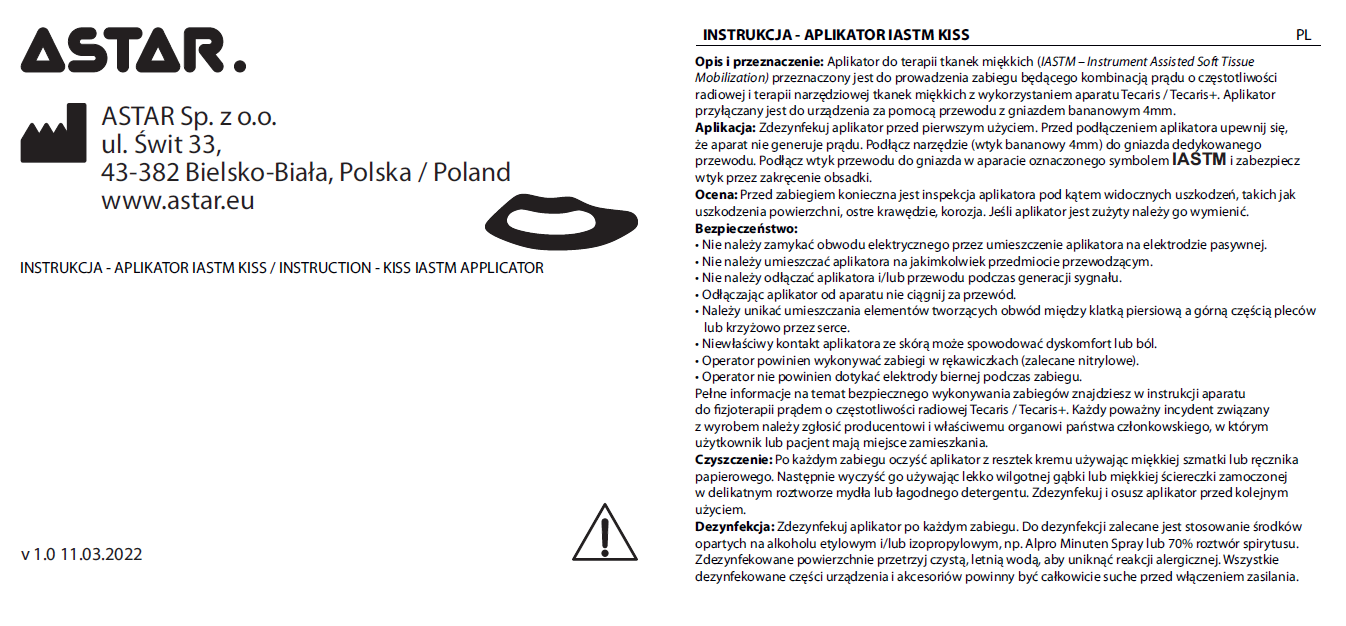 - Zestaw zawiera: Aplikator IASTM KISS wraz z przewodem.