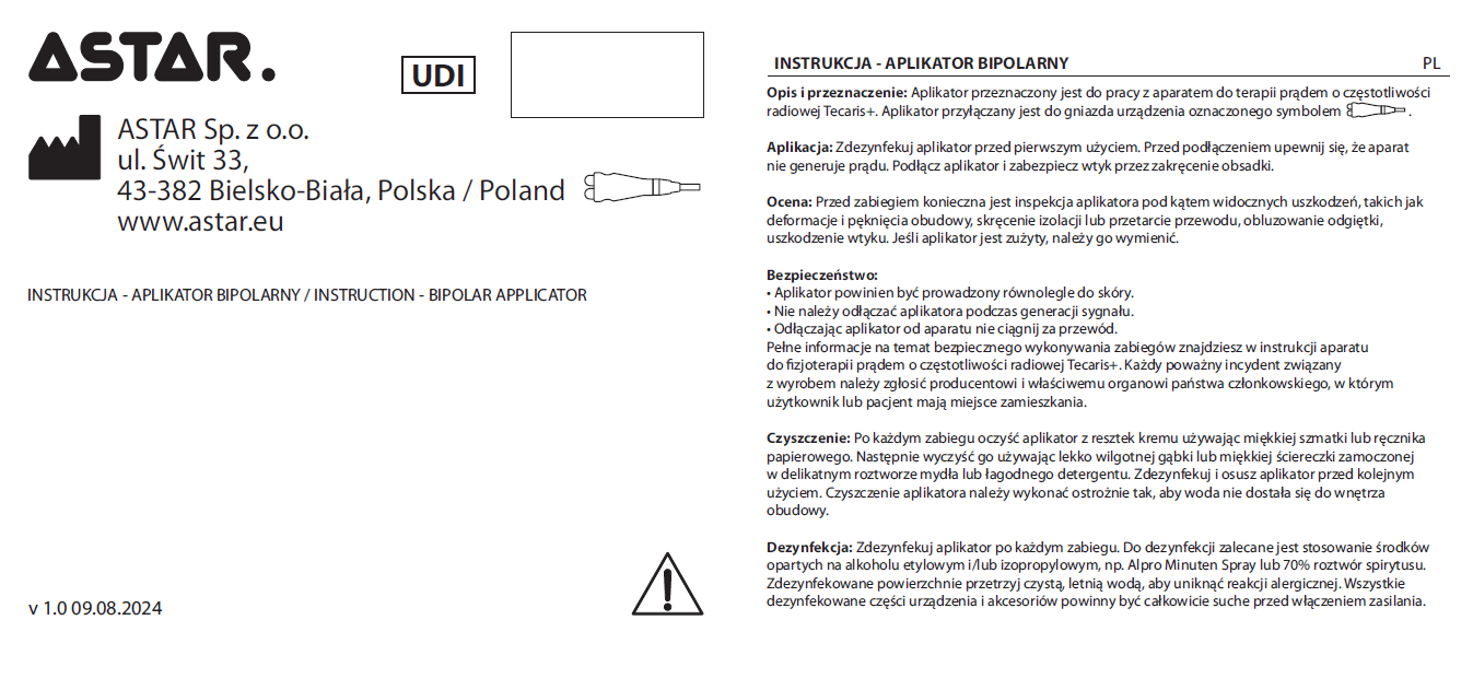 - Tryb bipolarny w urządzeniu Tecaris może być przeprowadzany tylko w połączeniu z elektrodą bipolarną firmy ASTAR.