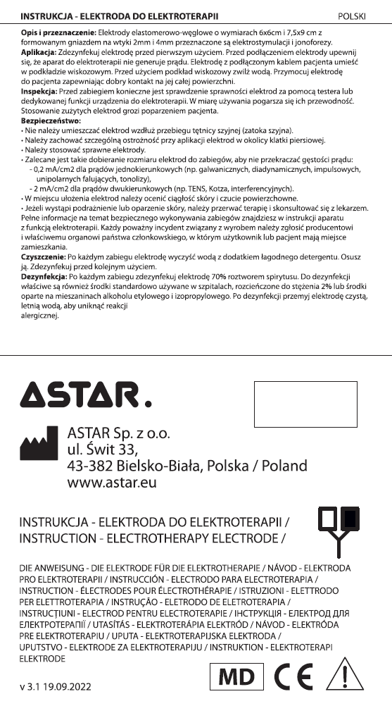 Elektrody do fizykoterapii firmy ASTAR są wytwarzane z odpowiednio dobranych materiałów, które zostały przebadane pod kątem: